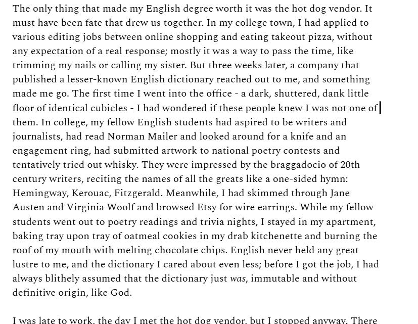 So, anyway. I submitted. Debilitating to be so free when I can’t really live up to it yet. Faltering. I can’t write about anything; I don’t even know how to read. I’ve been devouring articles from Brandon Taylor’s blog, desperate for advice on how to write good stories, real stories, actually fictional stories which are not thinly veiled anecdotes from my real life. As a child I wanted so strongly to teach myself everything. I believed in autodidacticism, the promise of the internet, the sharp knife of my own mind. It probably damaged me, although it did not feel it at the time, that I was often better than my art teachers at painting, or better than my English teachers at writing. In Grade 12 I took a course on writing fiction, and my teacher returned my first story to me with a note in red ink: Talk to me at the end of class. I don’t have anything to teach you! This is obviously exactly what I wanted to hear. When I visited her just after my first semester of university, months before COVID-19 would rip apart most of the social bonds I still had in Hamilton, she told me she still prints out my story and teaches it in that class.