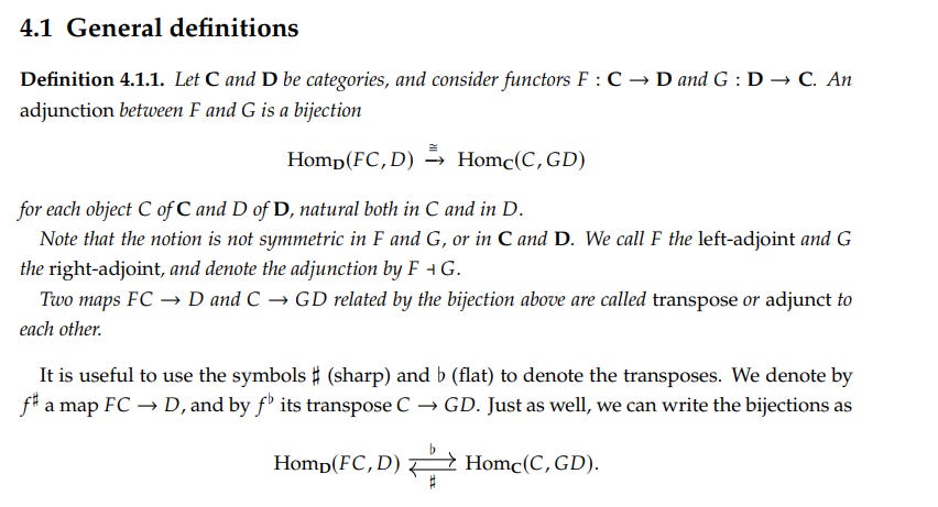 Like, what even is an adjunction? According to page 108 of the notes I’m reading, by Paolo Perrone, it’s the following: