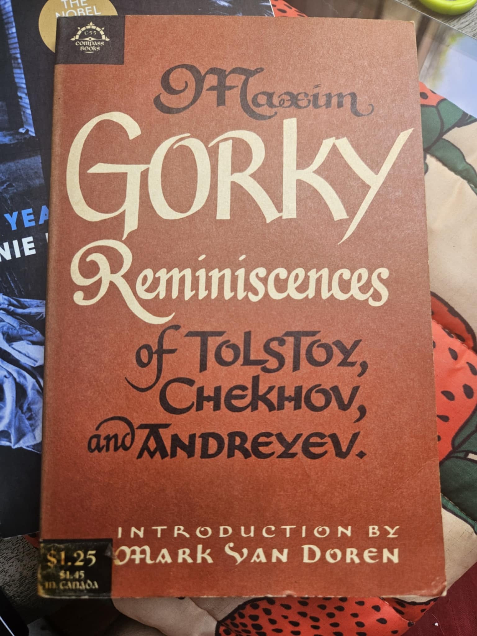 Dropped by my friend G’s house. Picked up him and his partner J. We drove to the Printed Word. I bought Break it Down by Lydia Davis. I bought The Years by Annie Ernaux. I bought this weird book called Reminiscences of Tolstoy, Chekhov, and Andreyev by Maxim Gorky. Always wanted to get into socialist realism, but it’s non-fiction. Translated by S.S. Koteliansky and Leonard Woolf (!). Hogarth Press printed it in 1920 but the copy I bought is a reprint by Viking Press. A physically beautiful book, copper orange paper, calligraphic white and black type, in the corner $1.25, $1.45 in Canada. No thin polyvinyl layer as far as I can tell. Every time I go here I’m mildly convinced the curly-haired guy behind the counter is a genius. The best English-language secondhand bookstore I’ve been to in Canada, better than the Word (sorry), better than the ones I’ve wandered through in Vancouver, Toronto, generally cheaper. And I’m always looking for The Wild Iris by Louise Gluck, but I never find it. I guess I could order it online, look on Ebay, but I’m waiting for the perfect moment in which it comes into my life.